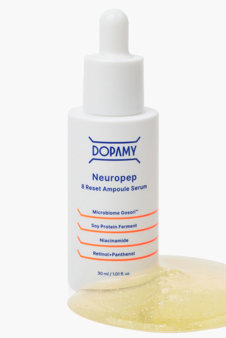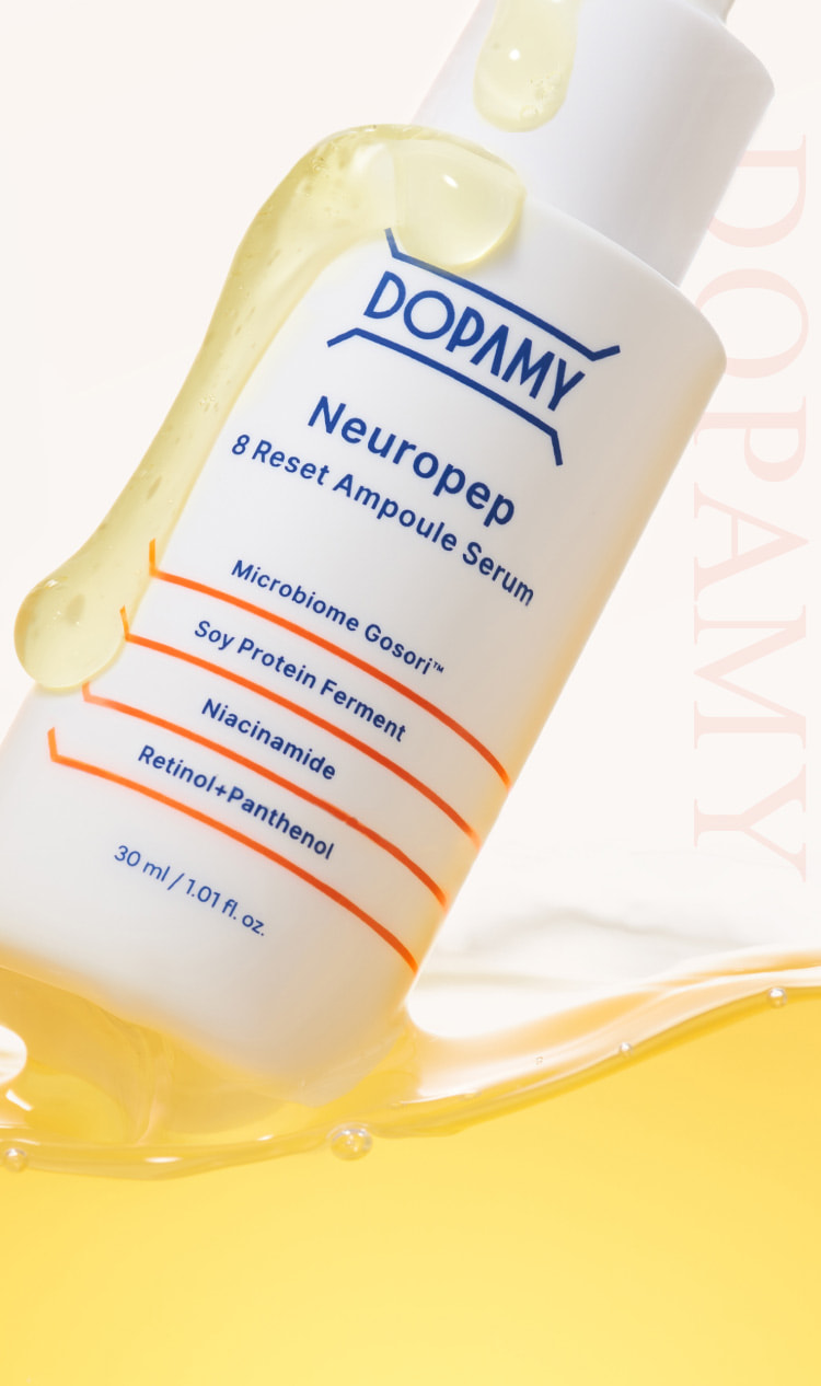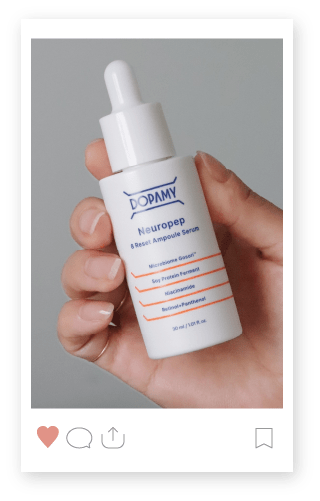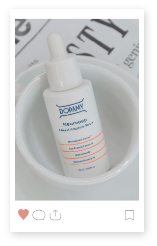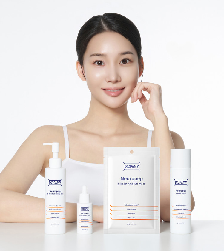 16種のボトックス様ペプチド群 Neuro Peptideでハリと自信が目覚める 4段階リフティング処方 Neuropep 8 Reset Ampoule Serum DOPAMYのニューロペプチドは一般的なペプチドと何が違うの? 14日間の臨床試験結果 シワ −12.92%減少 シミ −12.14%減少